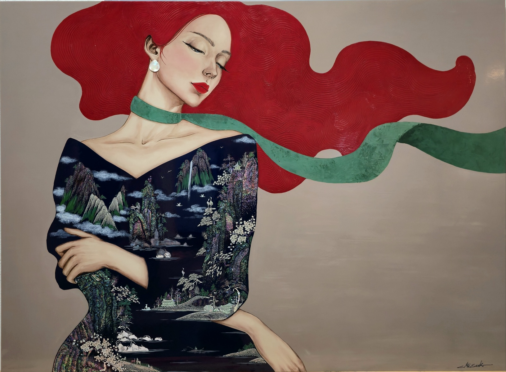 Misuk Kim is an artist who reinterprets Korea’s traditional materials—mother-of-pearl and lacquer—into contemporary portraiture. Her paintings portray captivating images of women, infused with elegance and resilience. With refined craftsmanship and a sophisticated sense of color, she creates unique surfaces where light and material harmonize. The subtle iridescence of mother-of-pearl and the depth of lacquer lend lyrical qualities to expressions and moods, forming an aesthetic that intersects tradition and modernity, decoration and painting. Through this practice, Kim expands the language of Korean beauty for the present day, offering viewers a visual experience that is at once powerful and graceful.